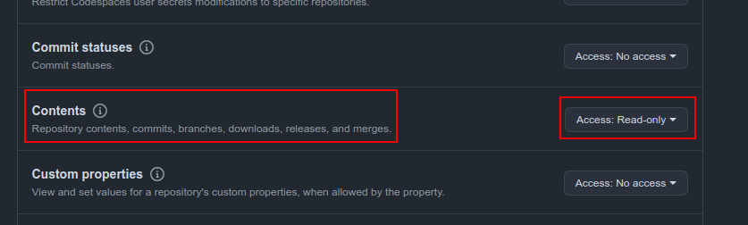 В разделе разрешений "Repository permissions" найдите строку "Contents" и установите для неё уровень доступа "Read only"