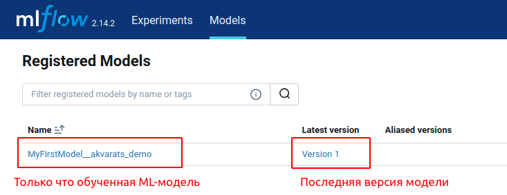 Названия ML-моделей являются уникальными среди всех пользователей AW. Если вы работаете на демо-сервере и решили выбрать какое-то слишком общее имя для модели (например MyFirstModel), то рекомендуется добавить после имени ещё какую-то уникальную последовательность символов (например, имя вашего пользователя, как и приведено в тексте ячейки). Иначе, если модель с таким именем уже была зарегистрирована, то вы увидите ошибку MlflowException: API request to endpoint /api/2.0/mlflow/experiments/get-by-name failed with error code 403 != 200. Response body: 'Permission denied'. Значит, пришло время выбрать другое имя для модели.