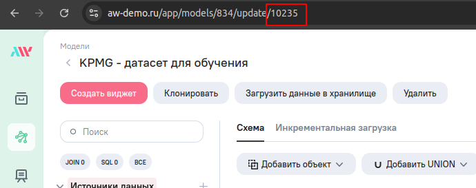 Вместо 10235 укажите идентификатор модели AW с вашим датасетом. Его можно узнать из адресной строки браузера. Это последние цифры в URL просмотра или редактирования модели AW.